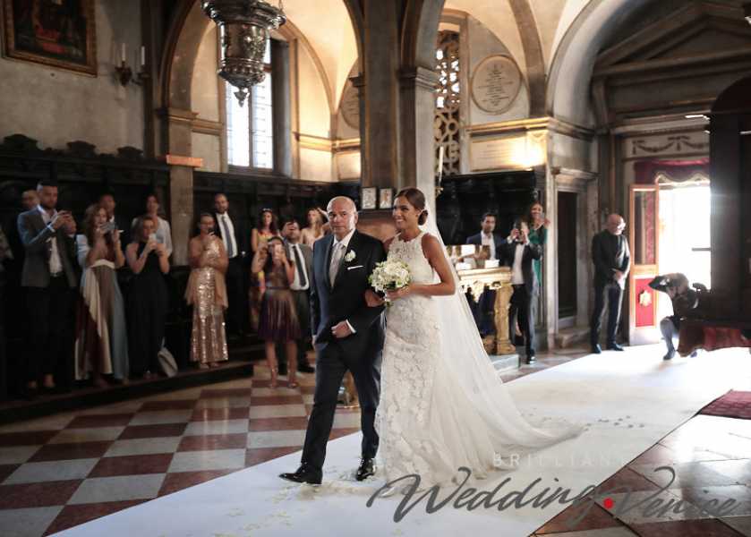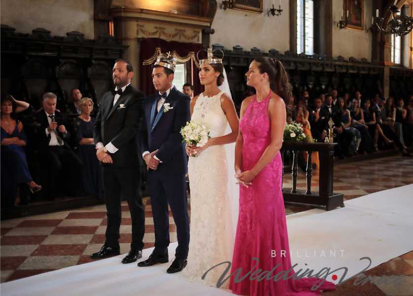 Giulia und Gabriel heirateten in der Kirche San Giorgio dei Greci mit einer orthodoxen Hochzeitszeremonie, die durch den berührenden Ritus der Kronen gekennzeichnet ist, das Symbol für einen Neuanfang. Durch dieses Ritual werden Braut und Bräutigam König und Königin einer neuen Familie und entscheiden sich dafür, sowohl Verantwortung als auch Privilegien zu teilen.