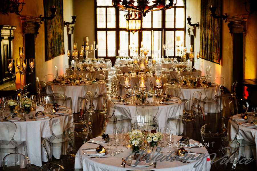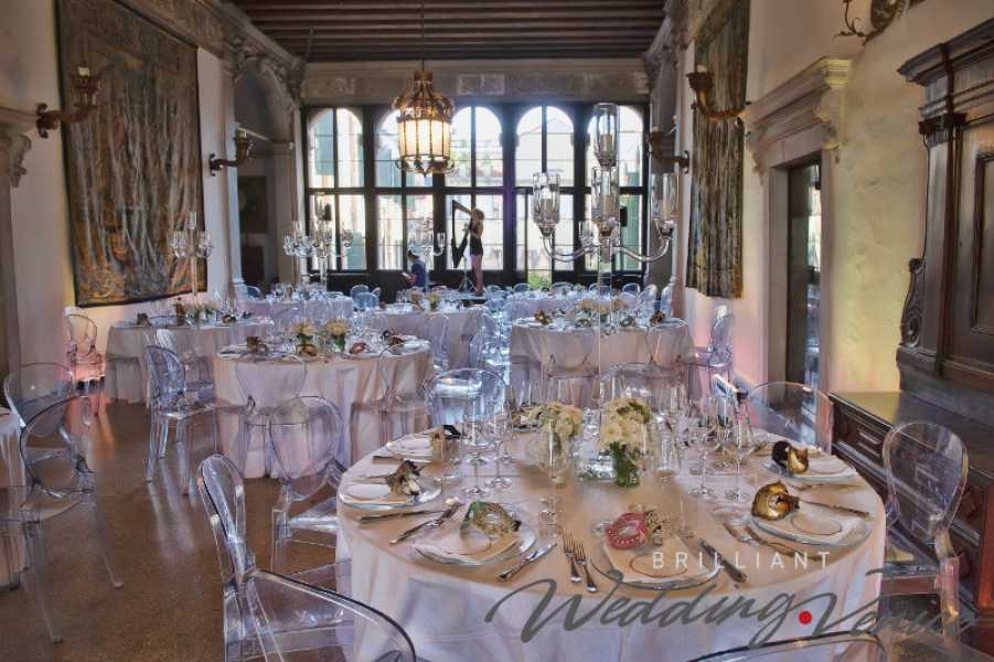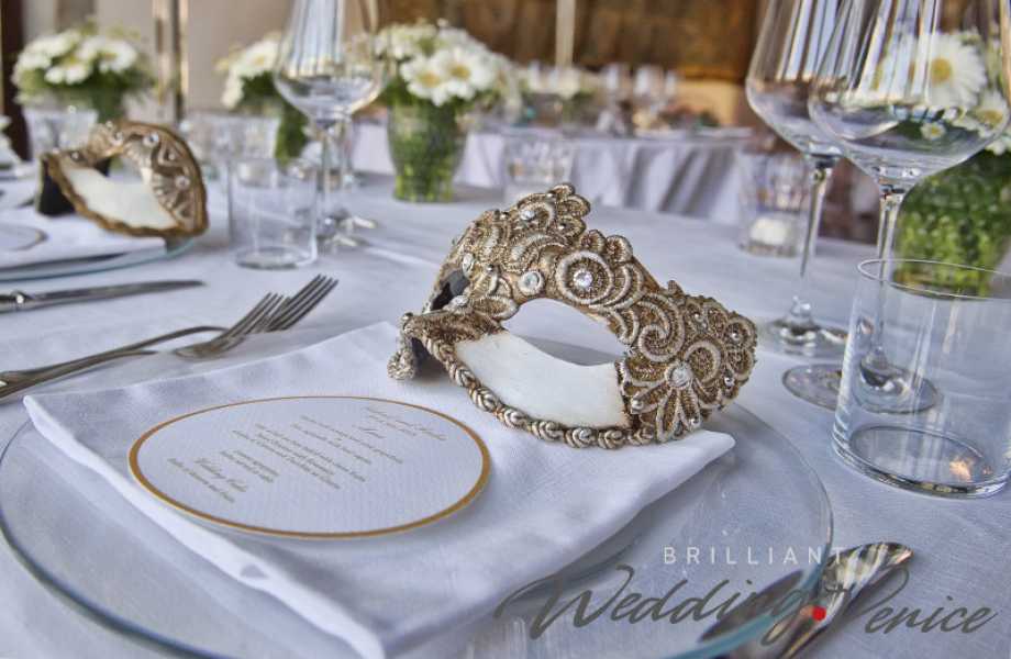 Der Palazzo Contarini Polignac ist ein eleganter venezianischer Palazzo, der um die Mitte des 15. Jahrhunderts erbaut wurde und einen wunderschönen Garten mit Blick auf den Kanal Grande bietet. Wir organisierten den Aperitif hier im Garten, das Abendessen fand stattdessen im Inneren statt. Wir bereiteten die Tische für alle 150 Gäste mit weißen Tischdecken und jeweils ein paar Gänseblümchen-Mittelstücken vor und platzierten auf jedem einzelnen Service-Teller eine weiß-goldene venezianische Maske.