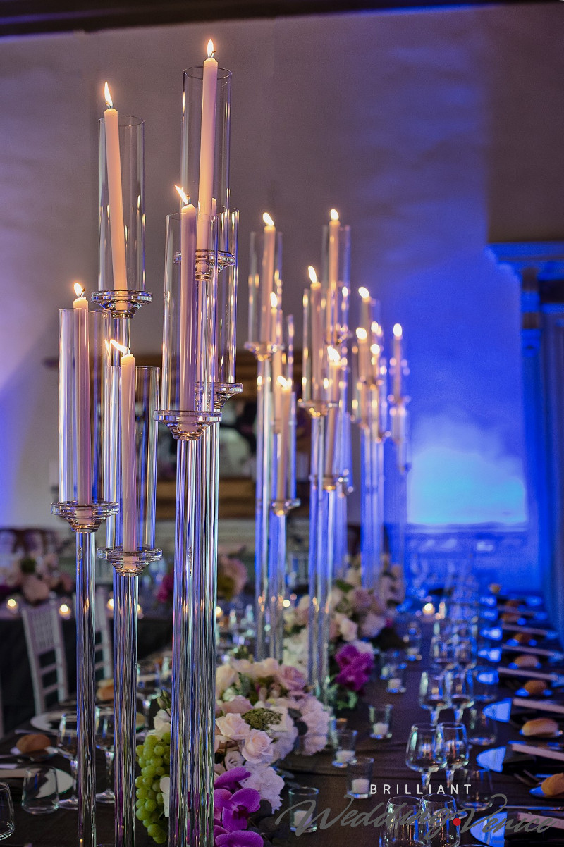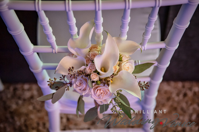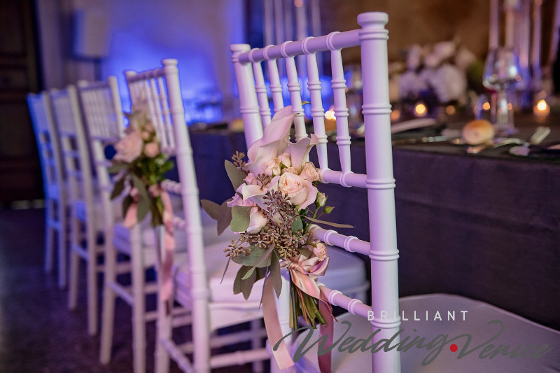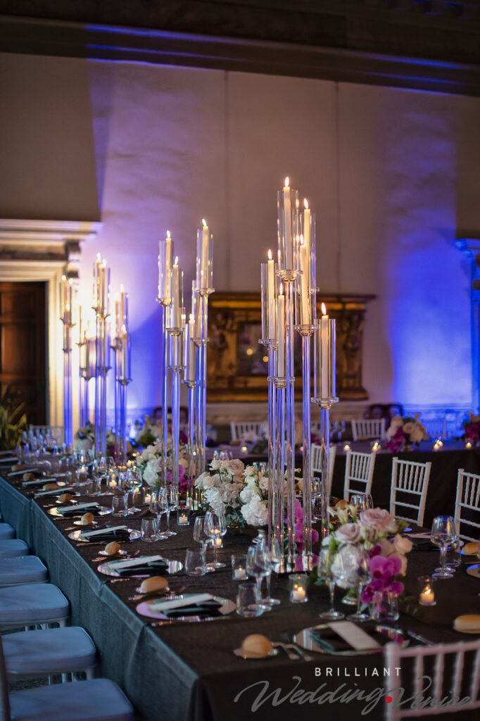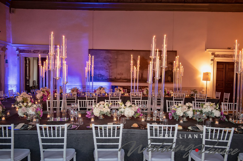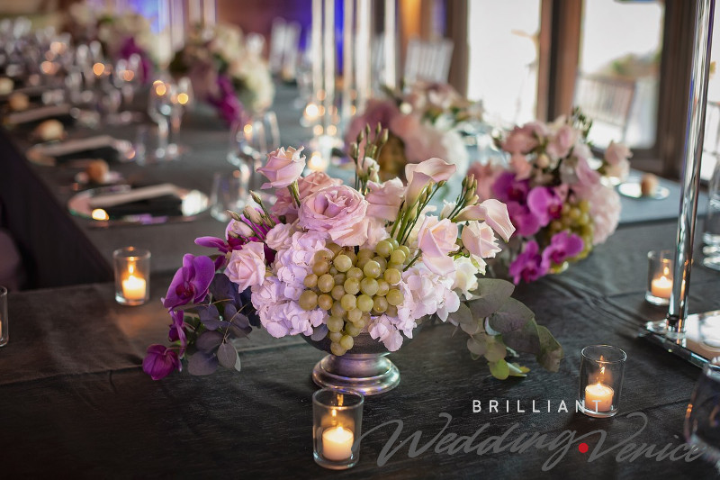 Wir arrangierten zwei lange Tische, die mit einer grauen Tischdecke bedeckt waren, und stellten jeweils vier hohe und elegante Kristallkerzenhalter auf. Wir dekorierten die Tische mit vielen Blumen Mittelstücken aus weißen Trauben, Rosen, Callas und anderen Blumen in den Farben Hellrosa und Weiß, je nach gewähltem Hochzeitsthema – dem Brautstrauß, den Blumen, die Veronica auf ihren Haaren trug, und der Blumenkrone, die wir für Lavinia gemacht haben, wurde mit genau den gleichen Blumen und Farben komponiert.