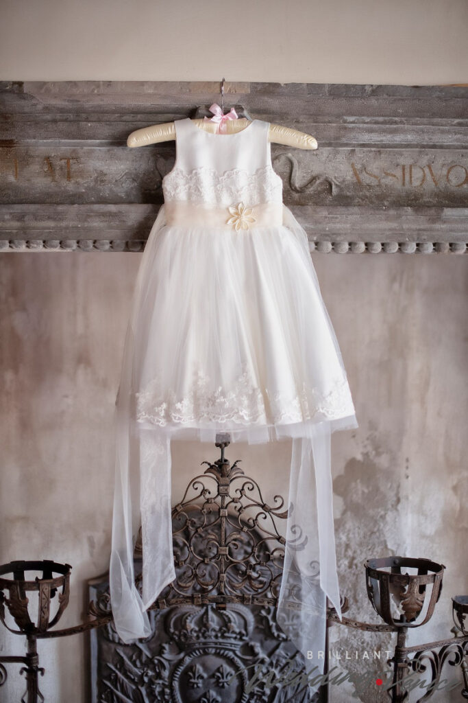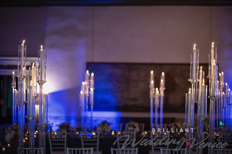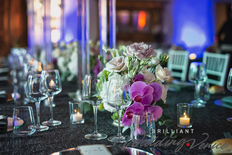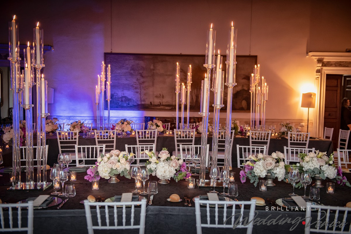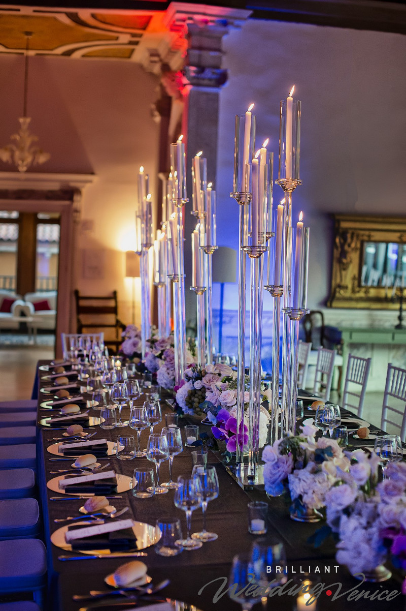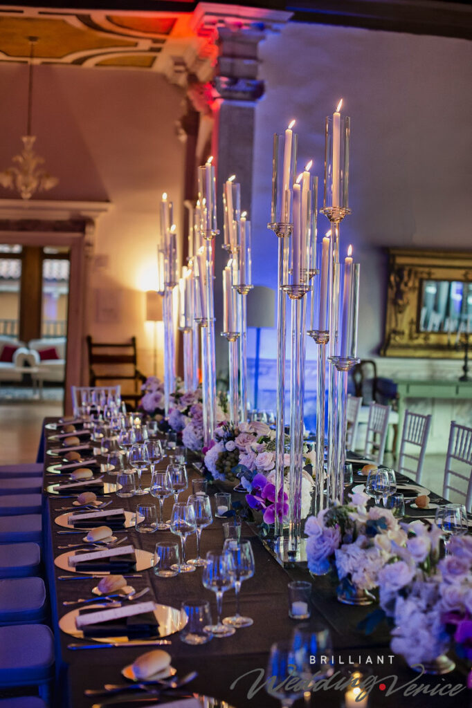 Wir arrangierten zwei lange Tische, die mit einer grauen Tischdecke bedeckt waren, und stellten jeweils vier hohe und elegante Kristallkerzenhalter auf. Wir dekorierten die Tische mit vielen Blumen Mittelstücken aus weißen Trauben, Rosen, Callas und anderen Blumen in den Farben Hellrosa und Weiß, je nach gewähltem Hochzeitsthema – dem Brautstrauß, den Blumen, die Veronica auf ihren Haaren trug, und der Blumenkrone, die wir für Lavinia gemacht haben, wurde mit genau den gleichen Blumen und Farben komponiert.