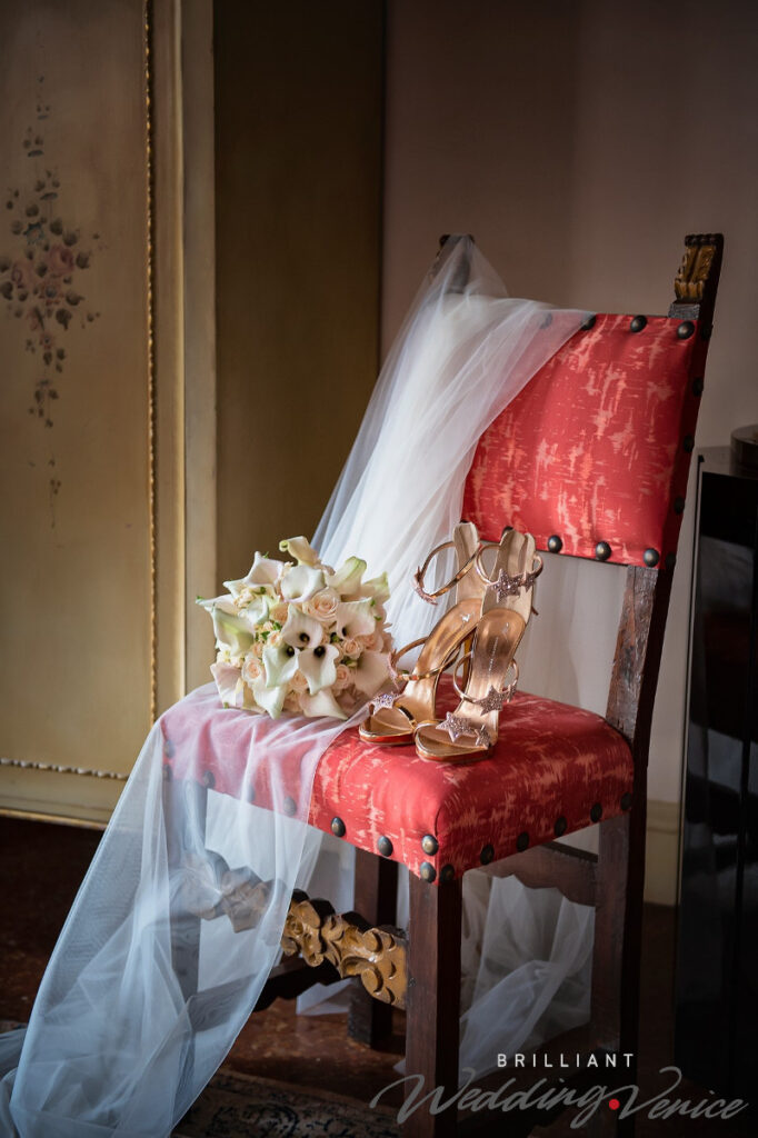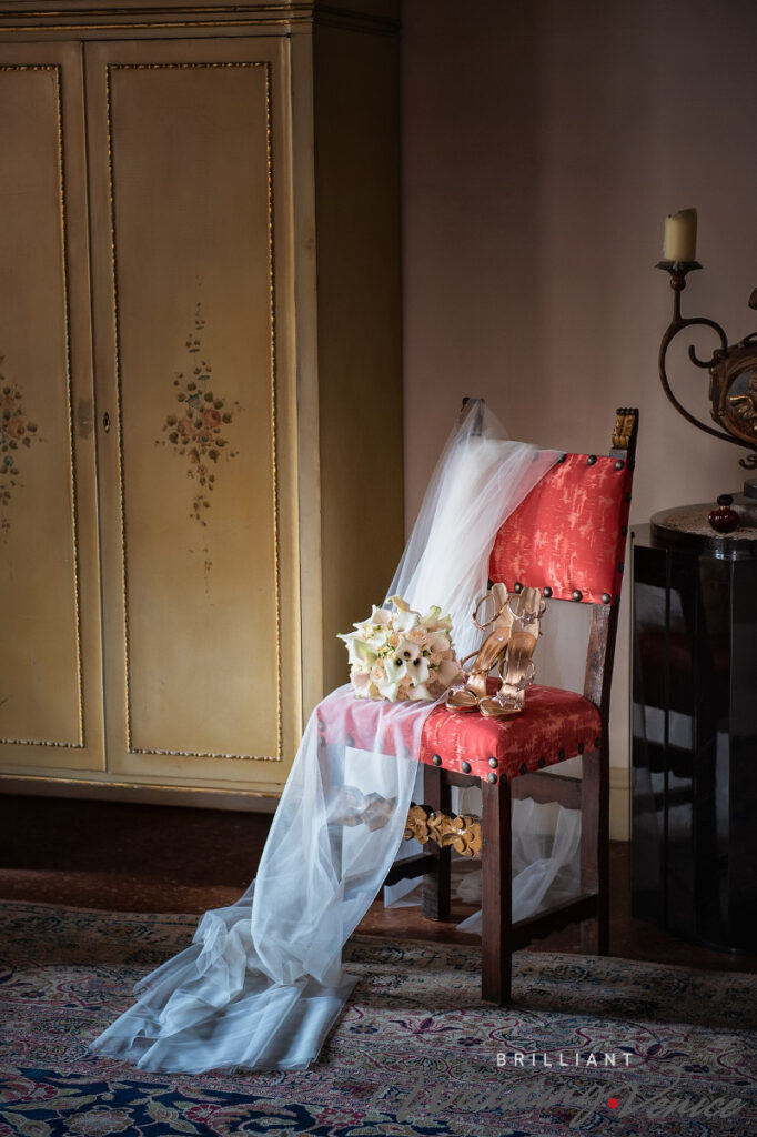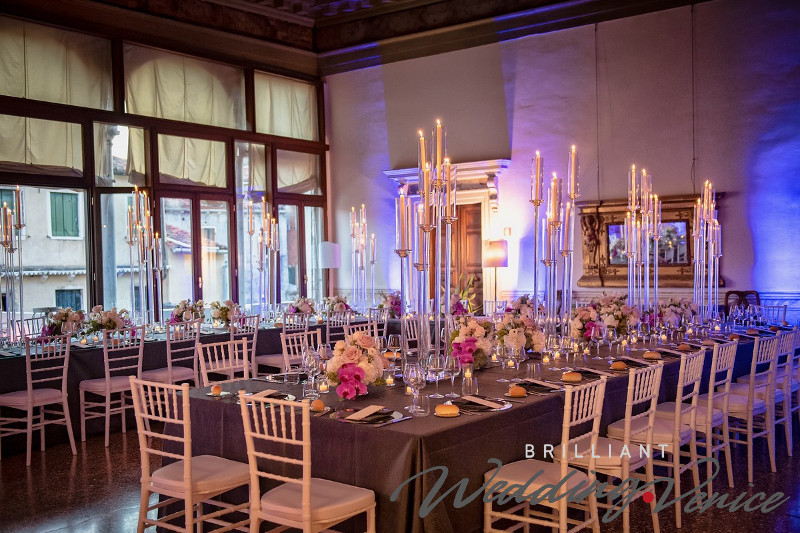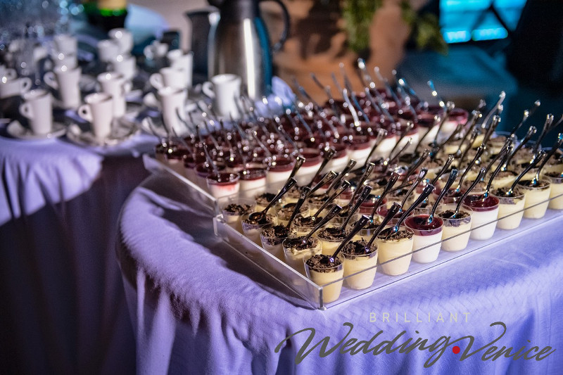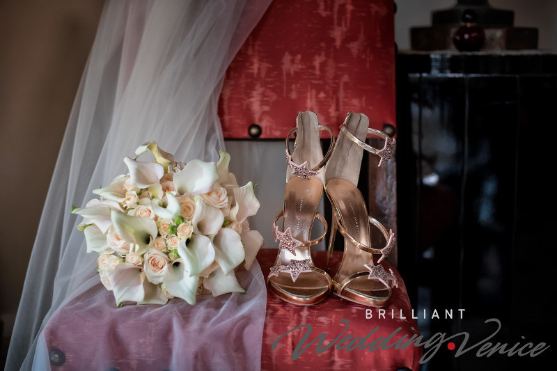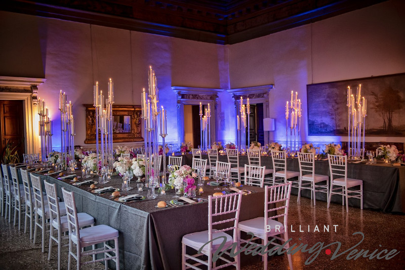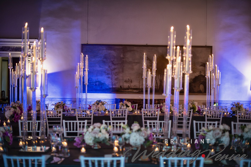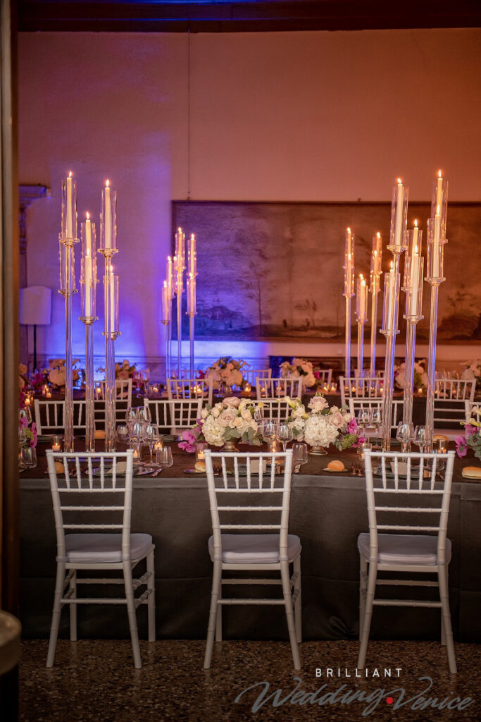 Nachdem der reichhaltige Aperitif vorbei war, zogen alle Gäste in den ersten Stock des venezianischen Palastes, um den Rest des Tages zu genießen, während das Brautpaar ein Fotoshooting in Venedig machte.