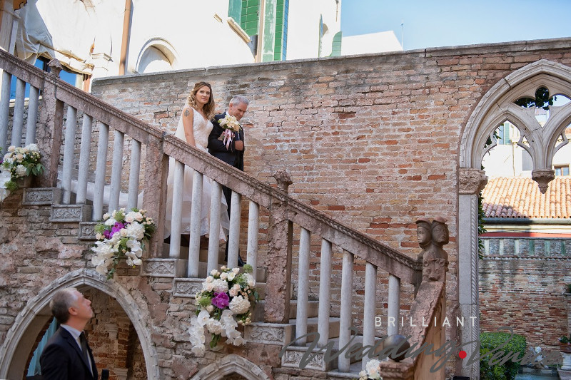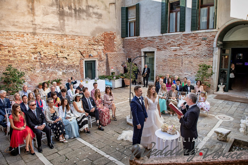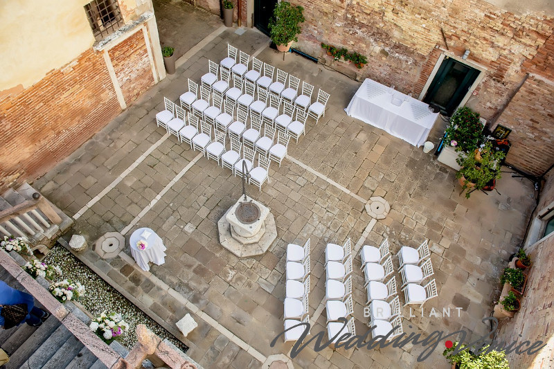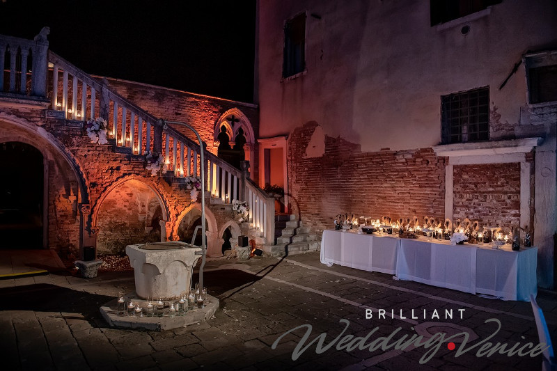 Alles im Hof war fertig, die Gäste waren gerade aus dem Wassertaxi gestiegen und genossen einen Aperitif und warteten darauf, dass Braut und Bräutigam auftauchten.