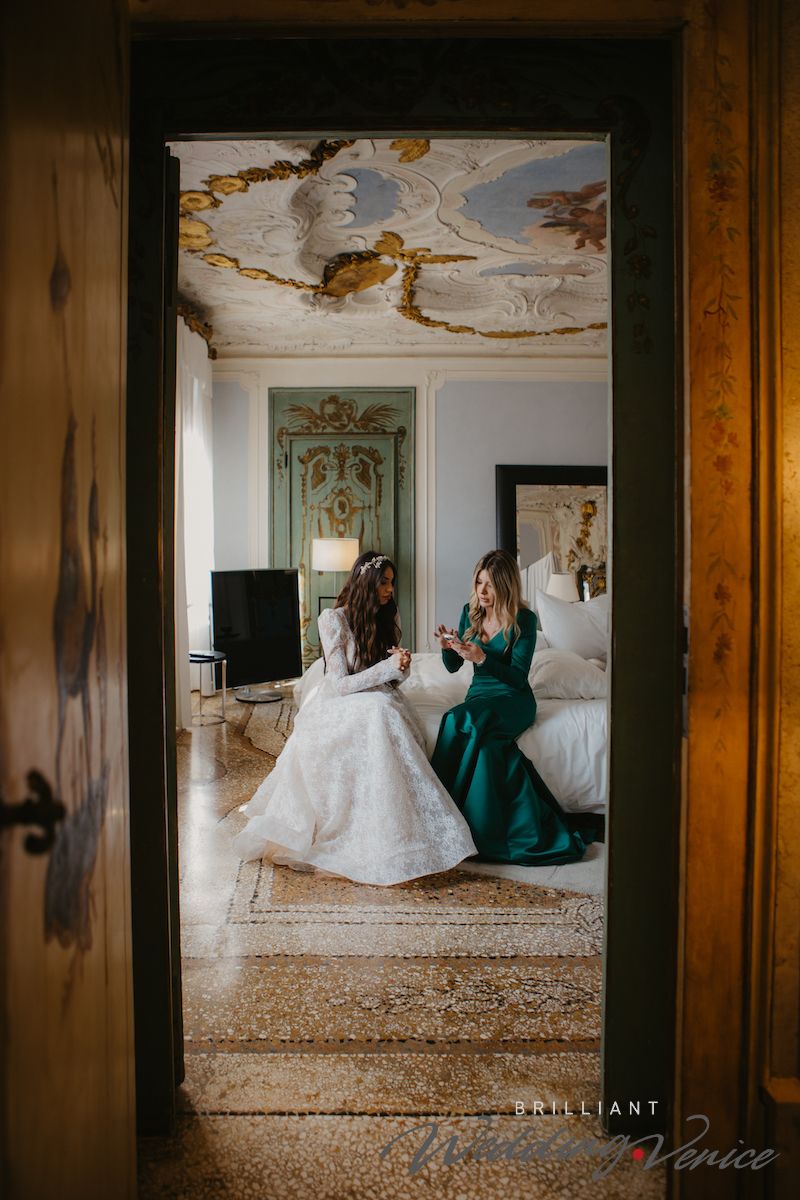 Am Tag der Hochzeit, nach den Vorbereitungen, trafen die Braut und der Bräutigam ihre Gäste in der Hotelhalle. Luxus-Wassertaxis warteten schon auf sie, um sie zum wunderbaren Ca‘ Farsetti Palast, einem der Hauptsitze des Rathauses Venedigs, für ihre standesamtliche Trauung zu bringen.