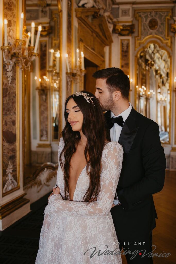 60 Gäste haben an Amina und Semirs luxuriöser venezianischer Hochzeit teilgenommen. Die Braut und der Bräutigam wollten, dass alle in diesem Traumhotel übernachten. Der Palast ist ein kleiner Luxus-Resort und es hat nur 24 Zimmer, die das Ehepaar für seine Gäste buchte!