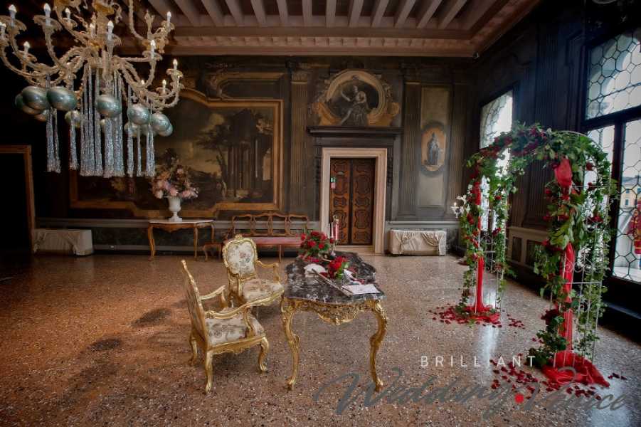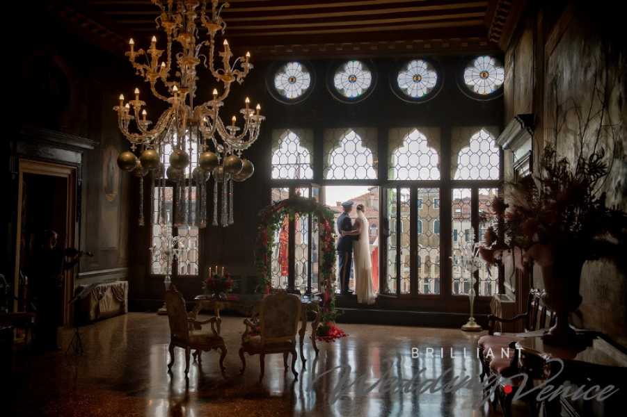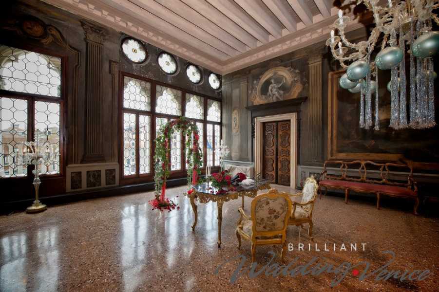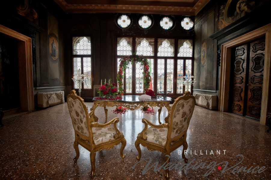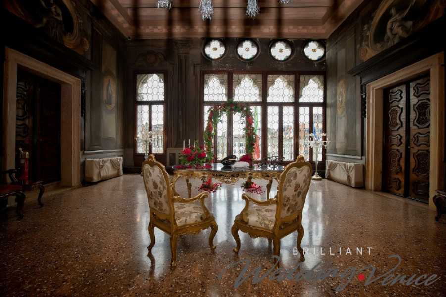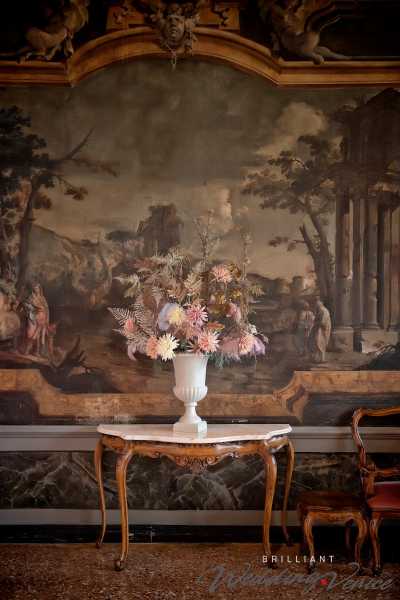 Vor dem Bogen, der direkt vor den leuchtenden Fenstern mit Blick auf den Kanal Grande positioniert ist, stellen wir ein paar elegante Stühle für Braut und Bräutigam und einen Tisch mit einem Blumenstrauß in den gleichen Farben wie der Brautstrauß und der Bogen.
