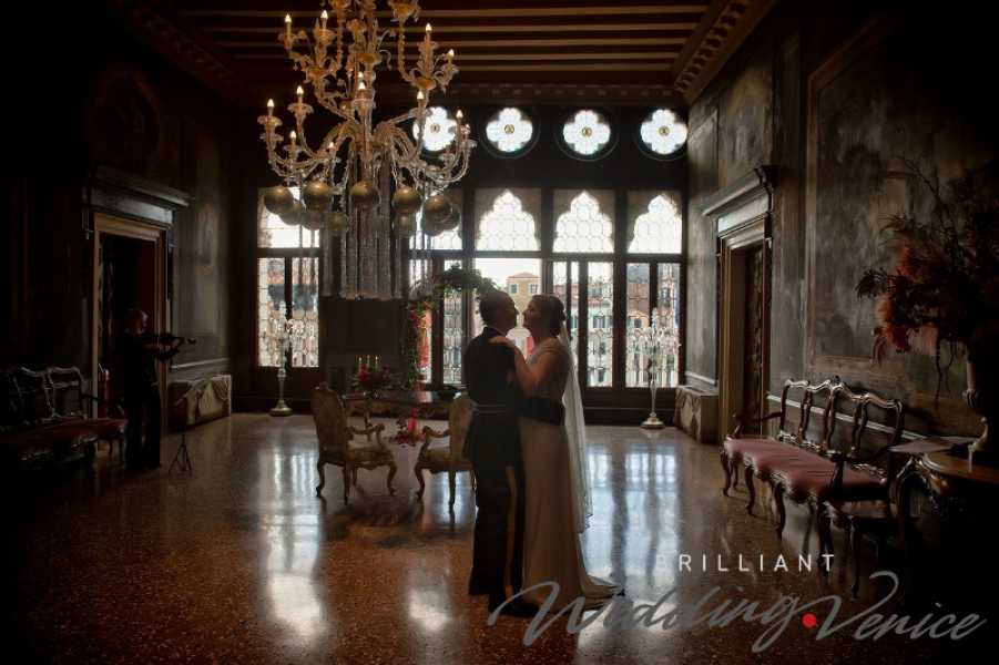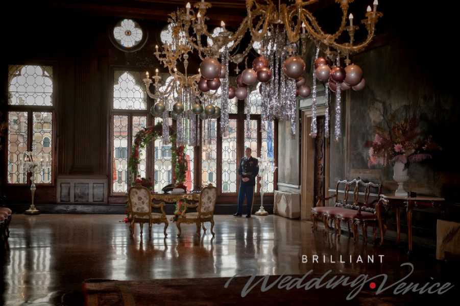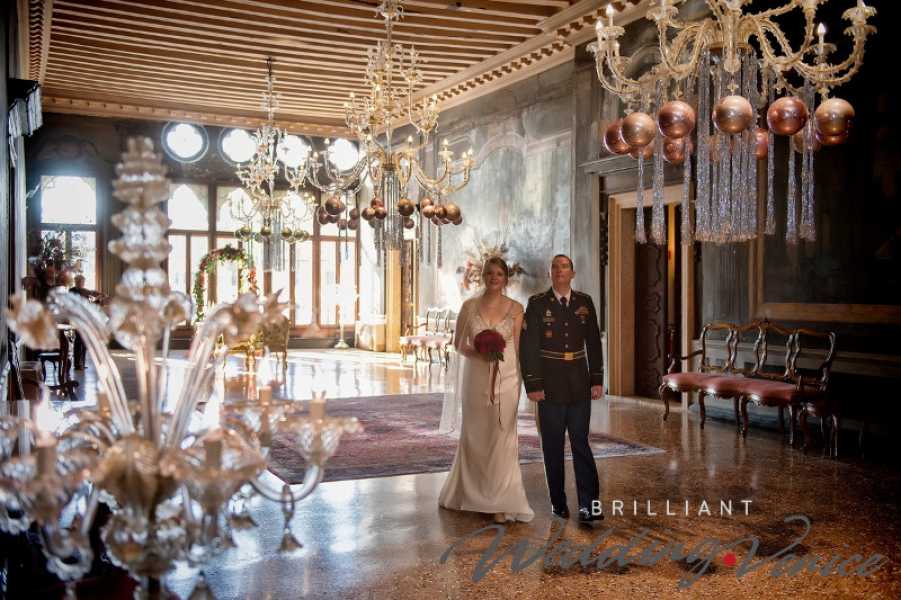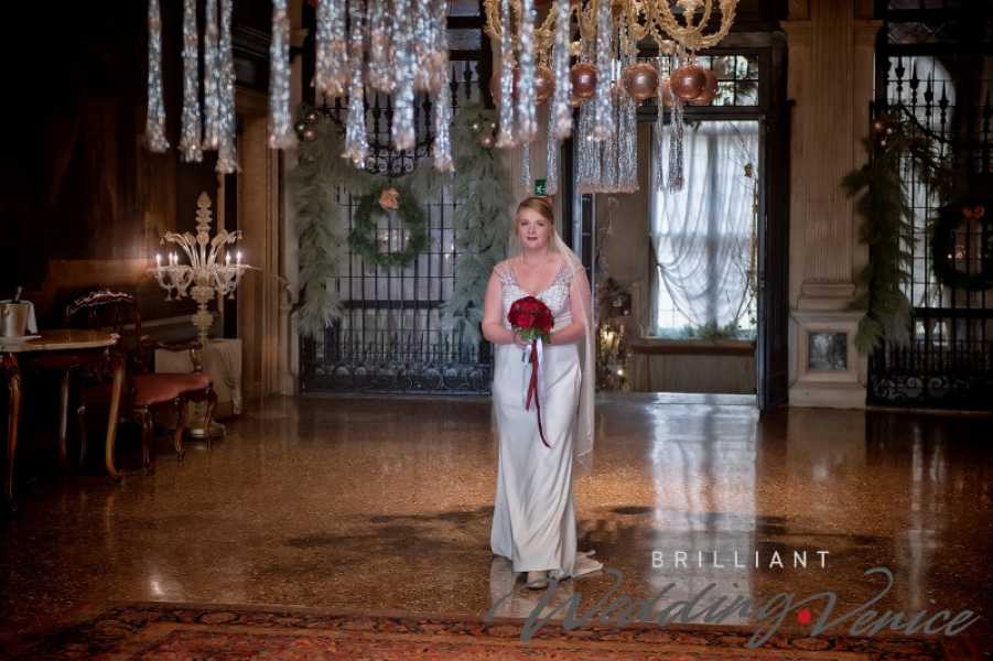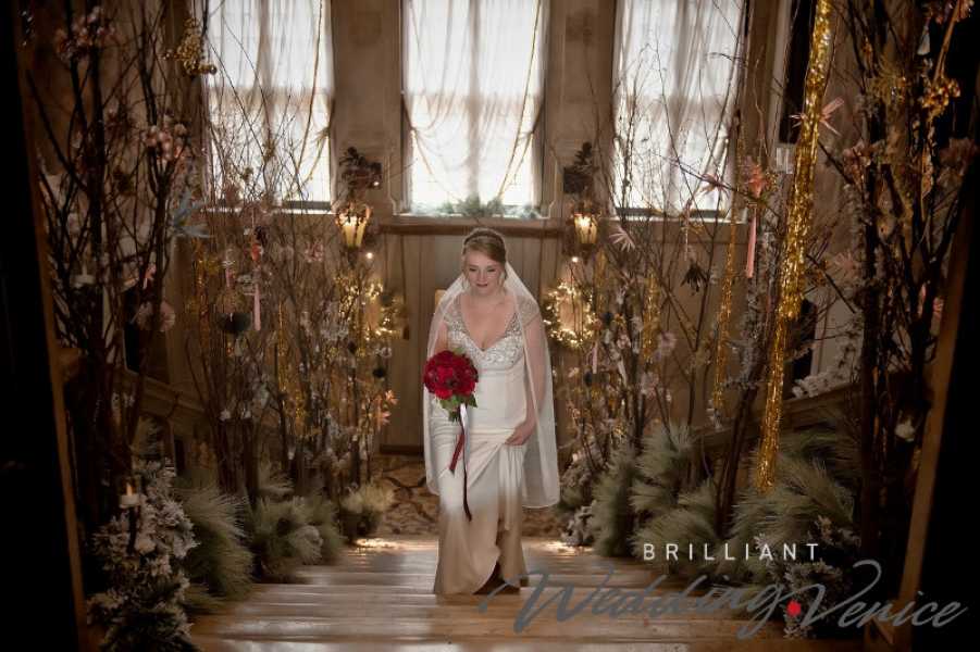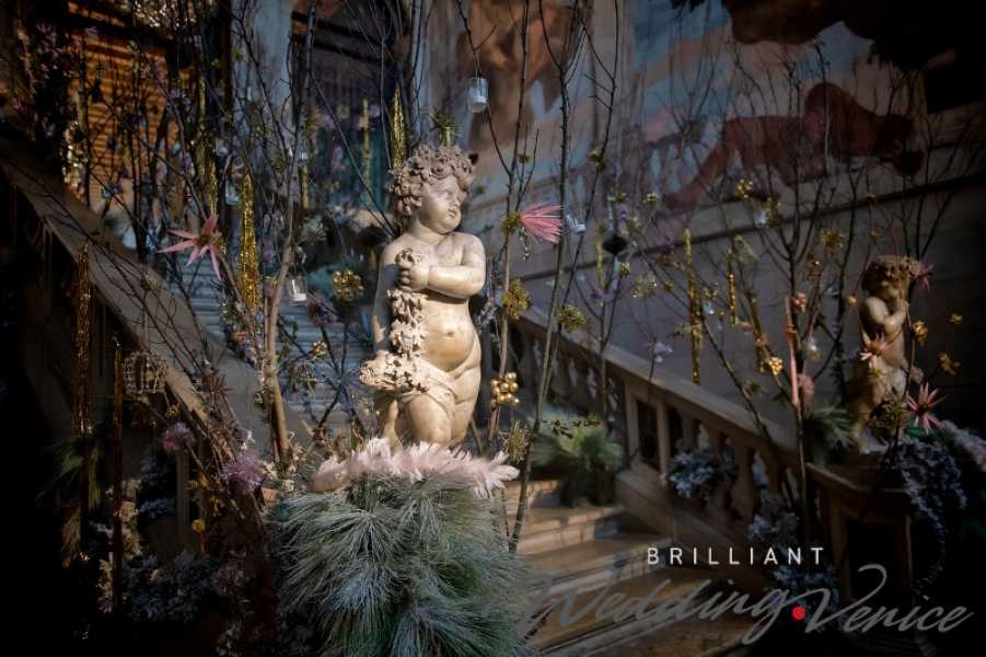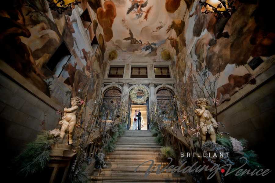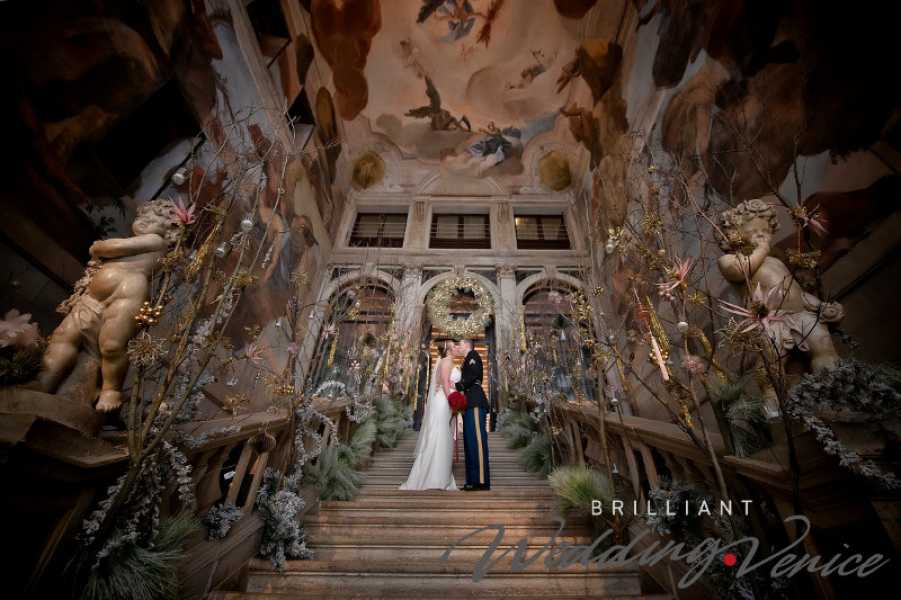 Die, die wir unserem Paar empfehlen, blickt auf den Kanal Grande und zeichnet sich durch eine prächtige Marmortreppe aus, die zu Weihnachten mit Blumen, Tannennadeln und goldenen Zweigen geschmückt war. Während Makaiah die Treppe hinaufstieg, war es, als würde sie einen Feenwald überqueren, der von Elfen und anderen magischen Kreaturen bewohnt wird.