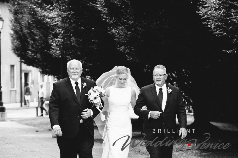 Brittany und Eric waren sichtlich glücklich und berührt direkt vor der Kirche, und nach ein paar Bildern mit ihren Familien war es Zeit für die Gäste, die Villa Foscarini zu erreichen, und für das gerade verheiratete Paar, zum Fotoshooting in die Villa Pisani zu gehen.